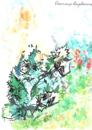 Осотище-стервотище наїжачився усіма своїми колючками . Він лютився чимраз більше на весь світ. Після того, як господар городу викорчував його зі своєї картоплі, котра пропадала від Осотиська, і жбурнув на купу хмизу, він доповз до клаптика землі і вкоренився знову. Як помилився господар, не спаливши його відразу! Пожалів, а Стервотище вижив ( усе стервотне – живуче ) – тепер мстить усьому світові. Особливо від нього потерпають красуні – кульбабки та діти, що веселяться на лужку. Він ранив їх своїми колючками.