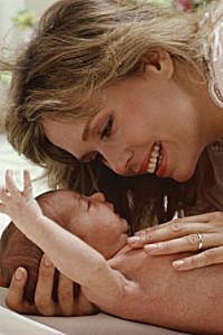 Крепко прижимает малышку к груди.В конце кормления мед. сестра еле забирает девочку из рук матери.
